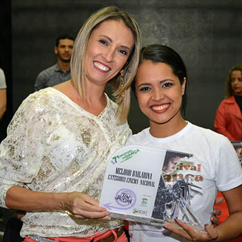 A bailarina Janaina Paula entrega prêmio para a colega Emilly Brito no Festival Municipal de Dança
