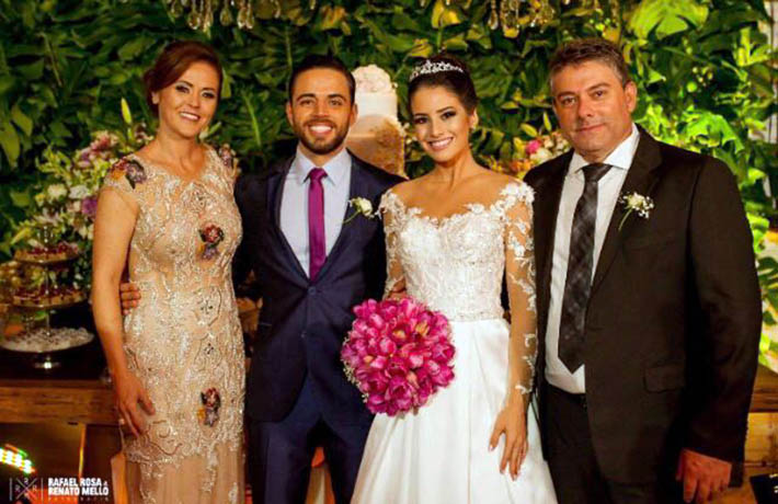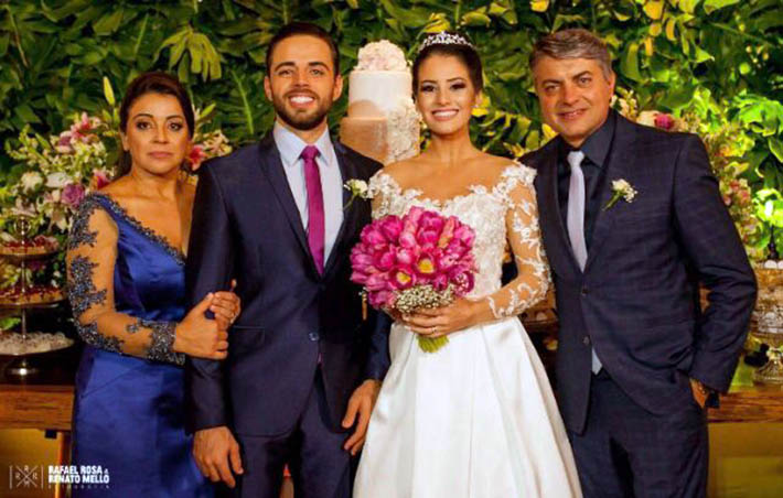 Entre os pais Simone Galbieri e Rogério Cabral, Catia e Valdecir Trindade, os noivos Henrique Trindade e Amanda Cabral durante o "Sim!" celebrado em Chapada dos Guimarães